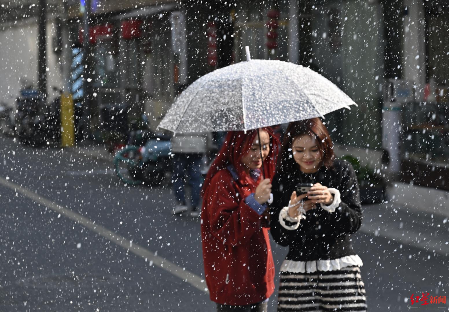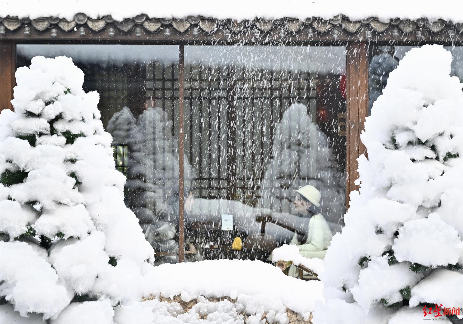 位于春熙路商圈的一家咖啡馆,“小雪”正在窗外缓缓飘下,这也吸引了不少顾客拍照打卡。