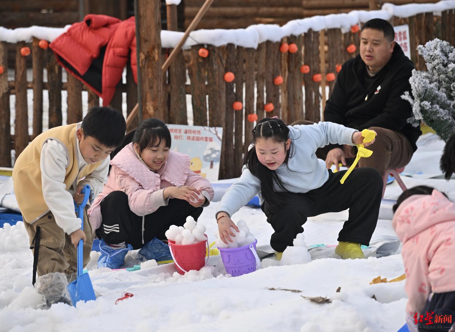 小黄鸭主题乐园内,孩子们在玩雪