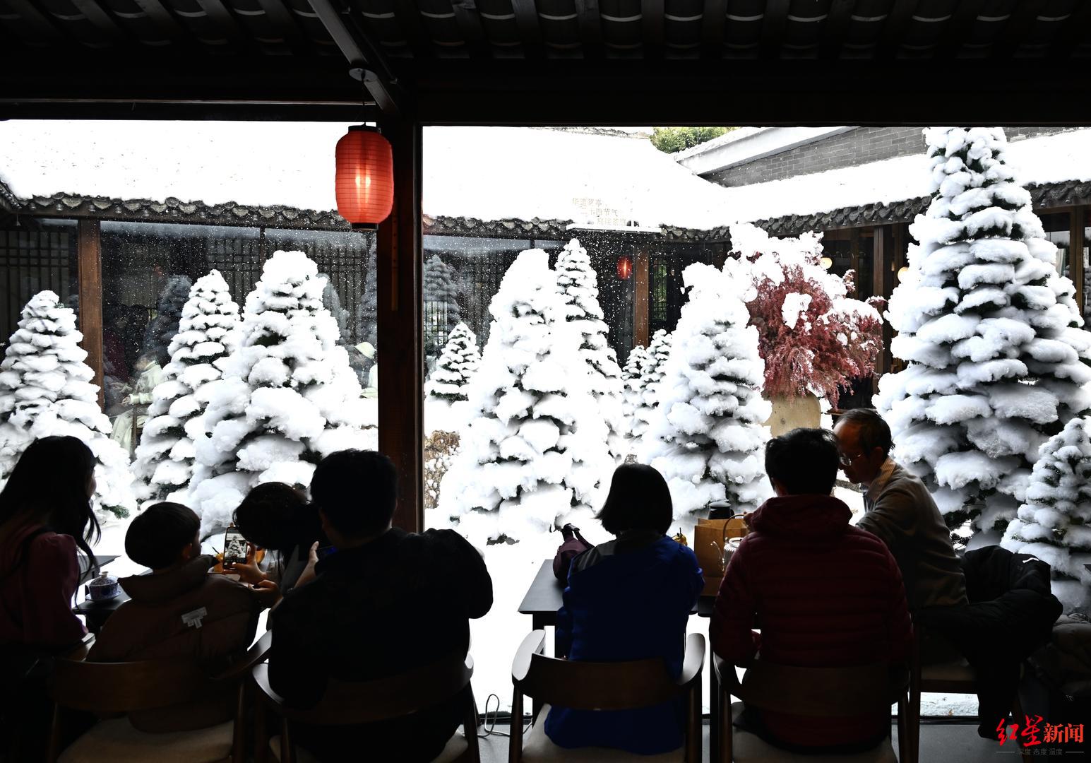 在城南铁像寺水街一家网红茶馆内的露天庭院,细密的人造雪花从装置中喷洒而出,缓缓飘落在积起“白雪”的树上。